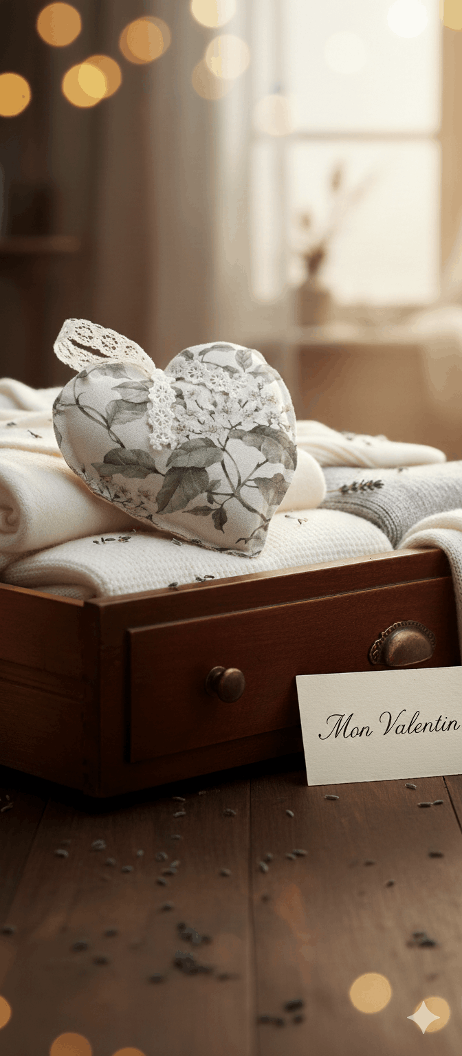 Un Secret Douillet : Glissé discrètement dans les tiroirs de sa commode, au milieu de son linge préféré, “Le Petit Valentin” infusera chaque tissu d’un sillage apaisant et réconfortant. Chaque matin, en choisissant ses vêtements, il ou elle retrouvera cette note parfumée, un petit “je t’aime” quotidien.