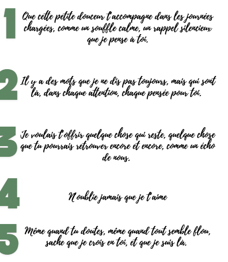 Que ce soit pour encourager, remercier ou simplement dire “je t’aime”, nous vous proposons une sélection de dix messages inspirants. Ce concept est particulièrement pensé pour les hommes ou les pudiques qui souhaitent offrir un objet porteur de sens, transformant une trousse de toilette ou de rangement en un souvenir impérissable.