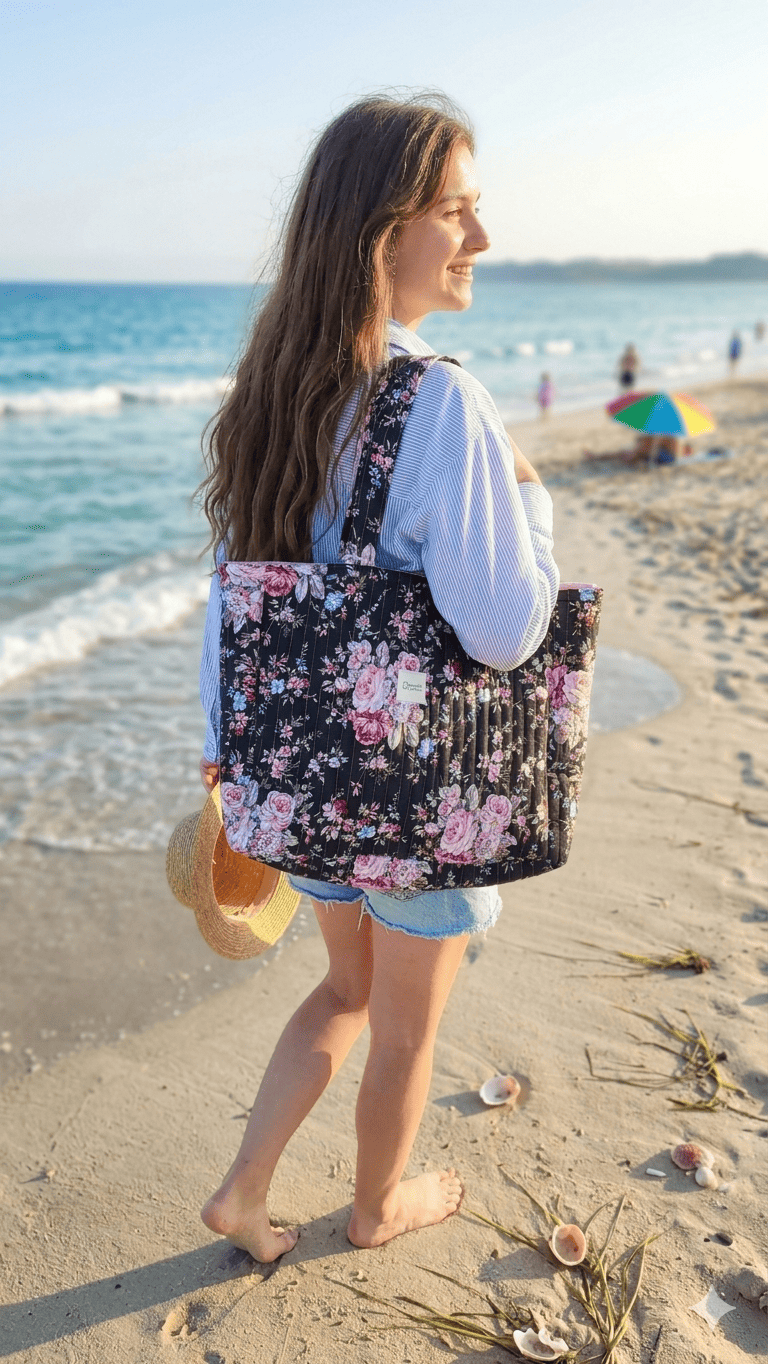 Le sac cabas « Cottage Nocturne» incarne l’élégance romantique et l’âme poétique de Chemin & Canopée. Son imprimé floral raffiné, composé de roses délicates aux nuances poudrées sur un fond noir profond, évoque les jardins anglais à la tombée du jour. Un contraste subtil et sophistiqué qui confère à ce cabas un charme cottage à la fois chaleureux, intemporel et résolument chic.