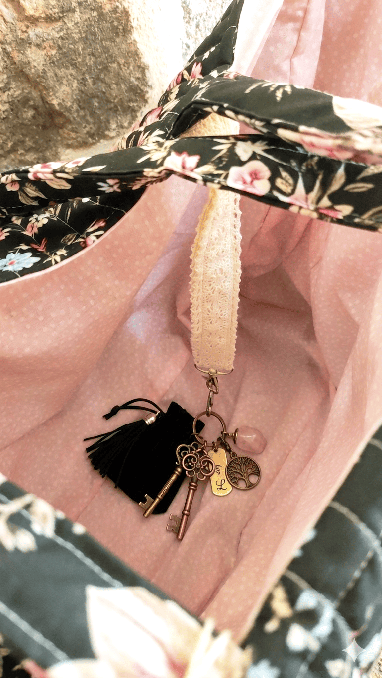 Une bride intérieure ornée d’une dentelle délicate, équipée d’un mousqueton doré, pensée pour accrocher vos clés ou une pochette assortie afin de garder vos essentiels (téléphone, porte-monnaie) toujours à portée de main.