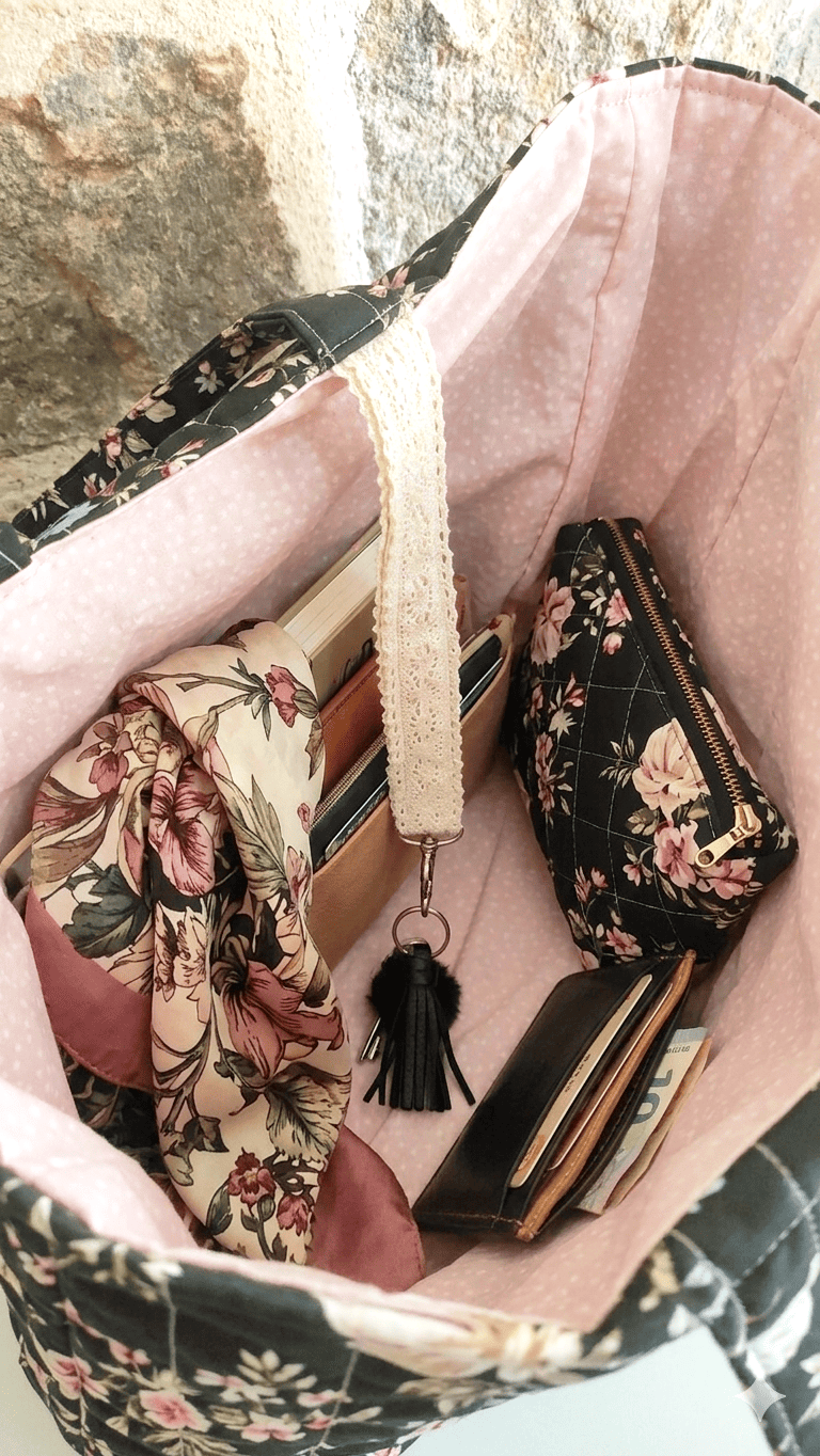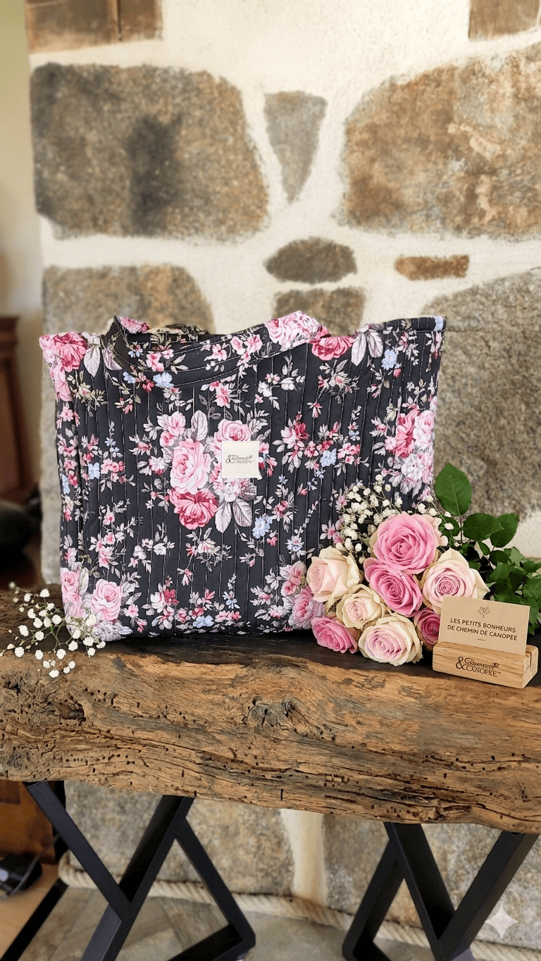 Découvrez le cabas “Cottage Nocturne” de Chemin & Canopée : un grand sac matelassé au motif floral élégant, alliant douceur du coton Oeko-Tex et détails raffinés comme sa doublure à pois dorés et sa bride en dentelle. La trousse est disponible en option.