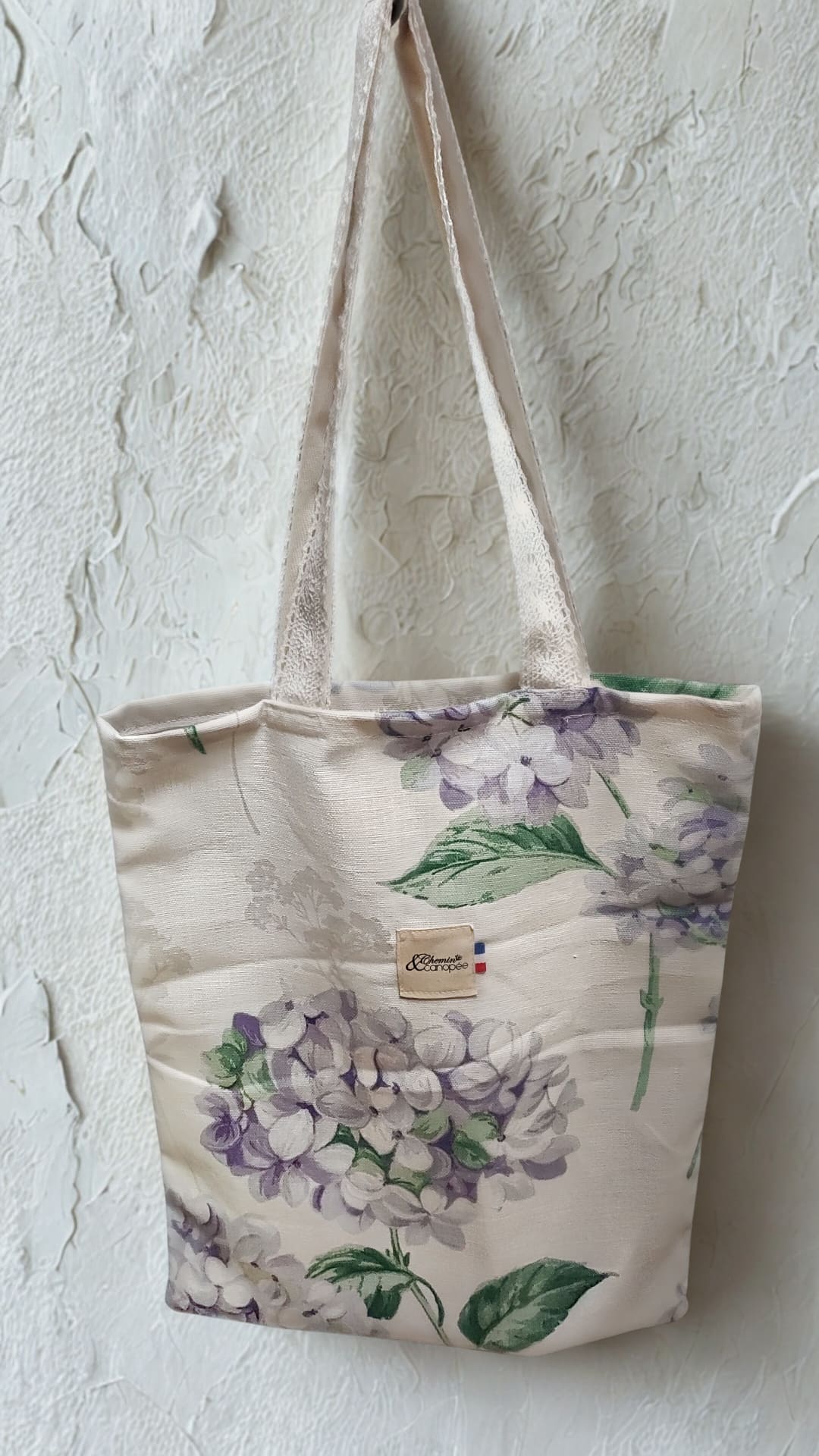 Tote bag Hortensias de Bretagne – Sac artisanal fleuri avec dentelle