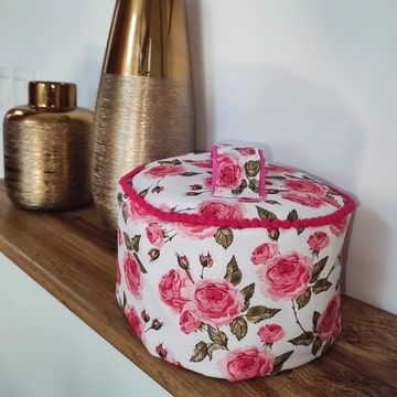 Cette panière de rangement ronde avec couvercle a été confectionnée sur commande pour une cliente souhaitant un vide-poche élégant afin de déposer ses clés et petits essentiels dès l’entrée de son appartement.