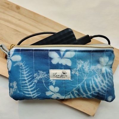 J’ai réalisé une trousse matelassée, offrant un bon maintien et une protection renforcée, tout en appliquant une imperméabilisation éco-responsable à base d’alun. Le tissu extérieur, créé spécialement en cyanotype à la demande de la cliente, apporte à cette pièce une dimension artistique et unique.
