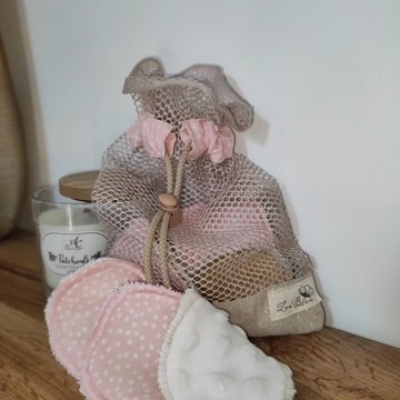 Cet ensemble de lingettes lavables et leur filet de lavage assorti a été confectionné sur commande pour une cliente souhaitant adopter une alternative durable et élégante aux produits jetables du quotidien.