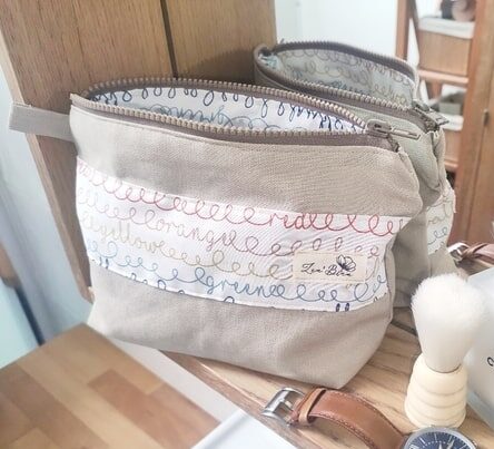 Ma cliente m’a confié la réalisation d’une trousse de toilette destinée à son mari, pensée pour accueillir ses accessoires et produits dédiés à l’entretien de sa barbe.