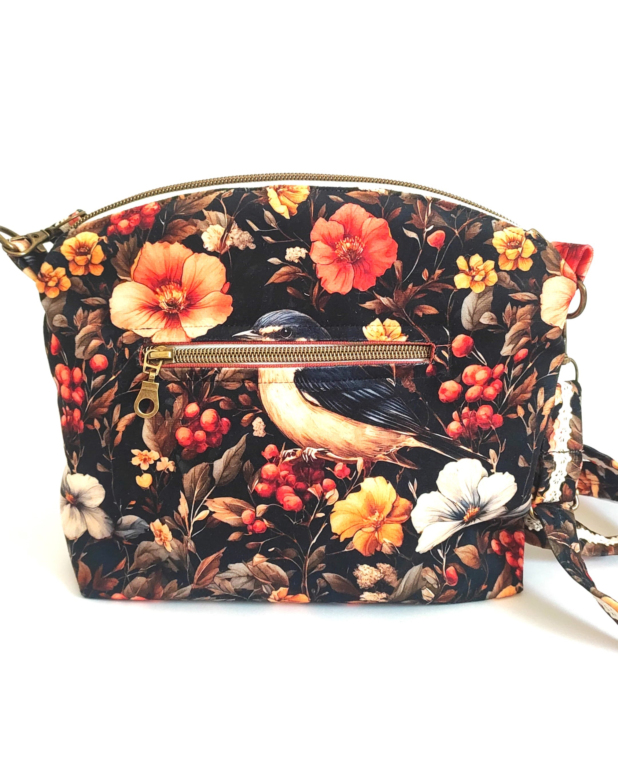 Confectionné à la main par des artisans passionnés, ce sac en velours noir s’illumine de fleurs et d’oiseaux aux teintes automnales, comme un petit jardin secret que vous emportez partout.